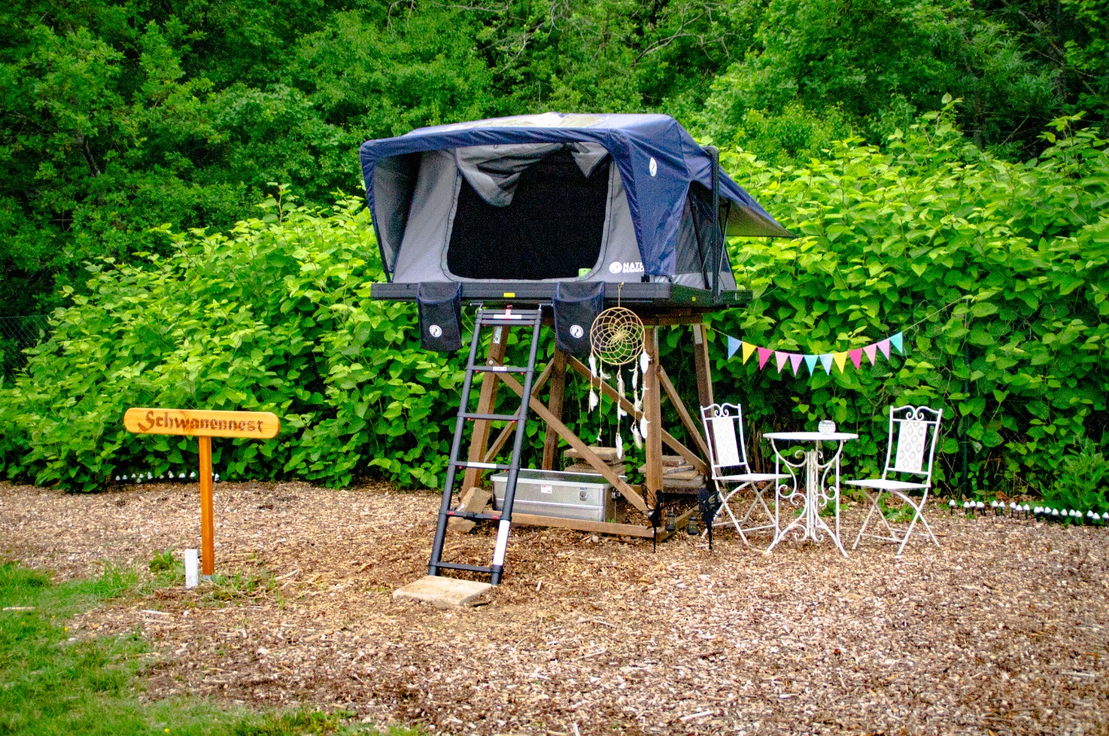 Das Dorf befindet sich auf dem Campingplatz-Gelände am Rande des angrenzenden Waldes. Auf vier Hochsitzen haben unterschiedliche Dachzeltvarianten ihren Platz gefunden, von denen du dich in ein ganz eigenes Vogel- und Naturparadies entführen lassen kannst. Im DACHZELT DORF Freilingen gibt es eine Feuerstelle und fußläufig entfernt, befindet sich der Postweiher, der mit seinem Strandbad zum Plantschen einlädt.